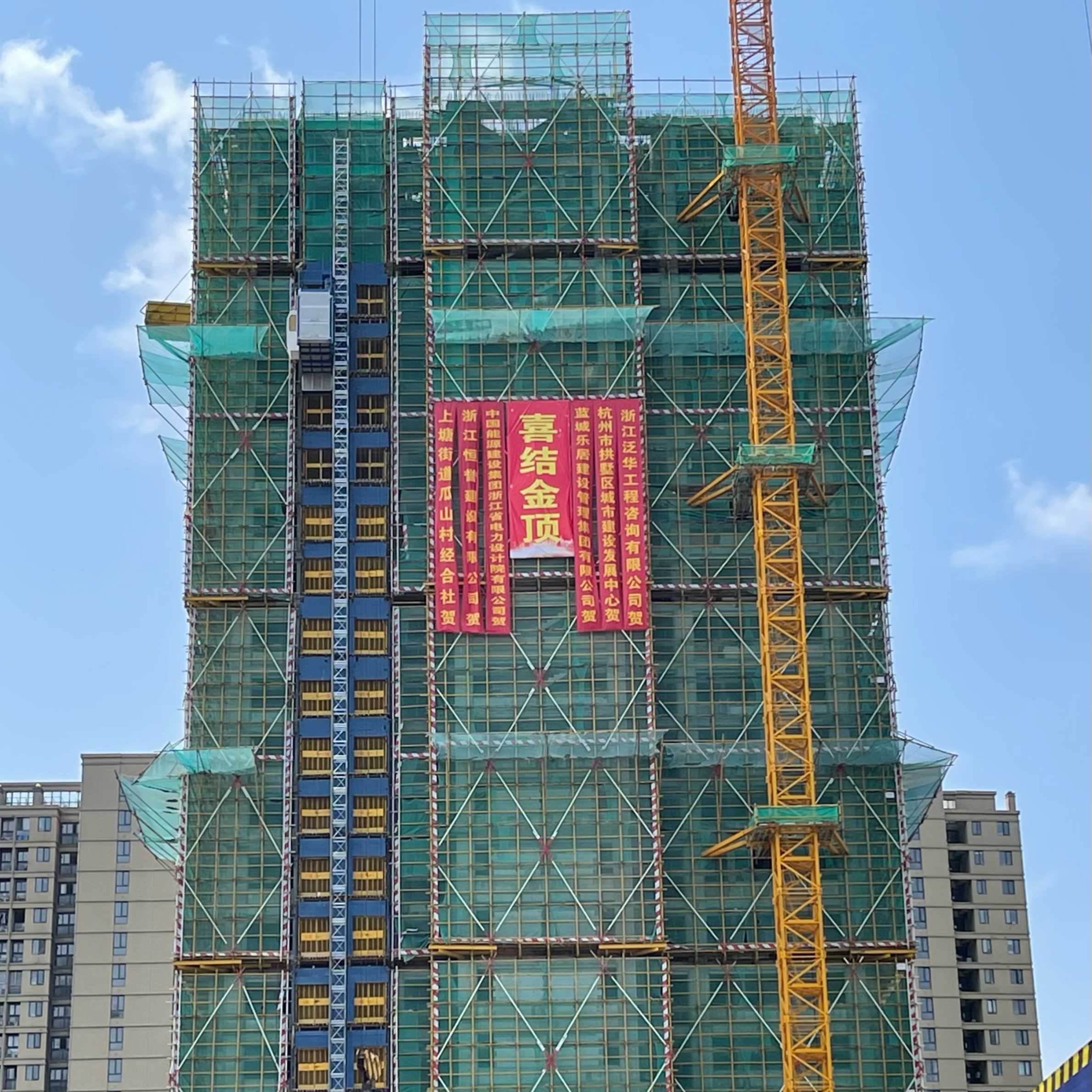 作为本项目极具意义的工程节点,在项目现场五方主体建设单位举行了结顶仪式。杭州市拱 墅区城市建设发展中心、蓝城房产建设管理集团有限公司、浙江泛华工程咨询有限公司、中国能源建设集团浙江省电力设计院有限公司、浙江恒誉建设有限公司等单位负责人、现场管理人员及瓜山村经合社相关领导、村民代表参加了仪式。